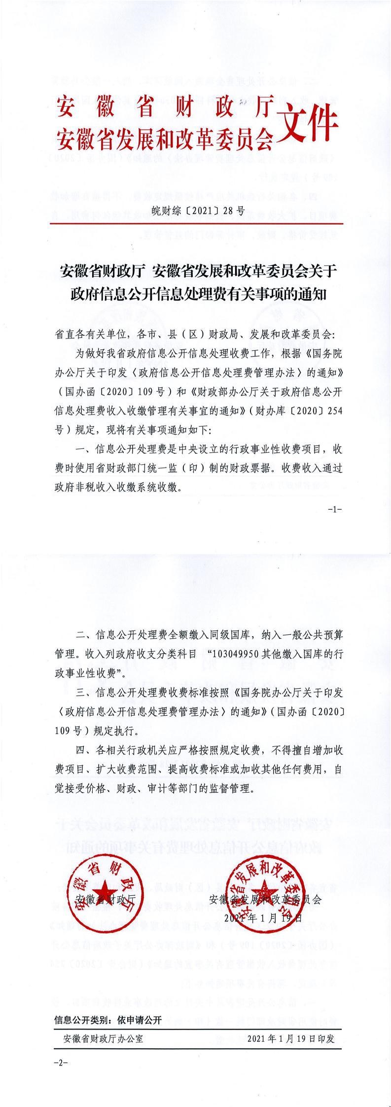 安徽省财政厅 安徽省发展和改革委员会关于政府信息公开信息处理费有关事项的通知
